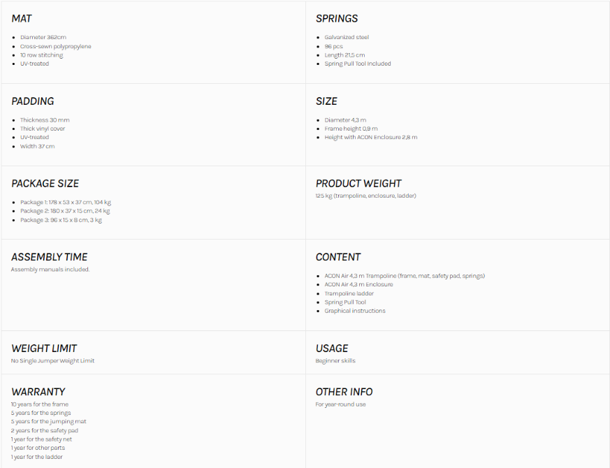 Meet the next generation of Air, Acon 14 ft/4.3m trampoline package with a premium safety enclosure. The Acon 14 ft/4.3m trampoline offers the best bounce in the business with more features than ever. Air series springs for more air. Together with the Premium Enclosure, the thick and soft padding offer even more protection. From the UV treated surfaces, galvanized steel frame to the springs and mat, every part of the 14-foot/4.3m trampoline is made for a fun, lifelong experience. Its two-tone coloring and sleek detailing add elegance to your backyard.