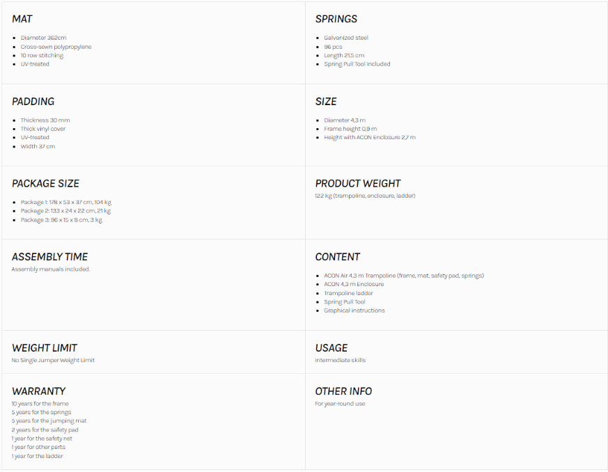 Acon offers industry leading warranties up to 10 years, 5-star rated customer support, trampoline accessories for more fun and spare parts for each trampoline model they make.