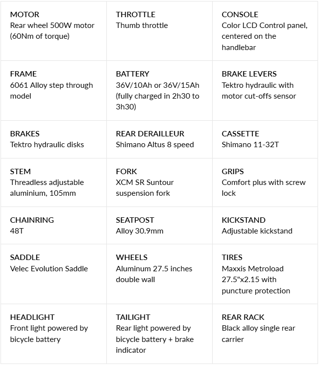 With its low, open frame, the E3's unique size adapts to cyclists from 4ft11 to 6ft. 27"5 wheels increase pedaling inertia and thus its range. The bike is equipped with a 500-watt rear-wheel motor, and a 36V 10Ah or 15Ah frame-mounted battery, which can be removed from the left side of the frame. The integration of cables and several components (controller, rear light) gives it a modern look and highlights the frame's Quebec engineering.